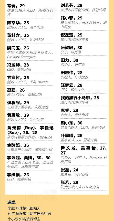 2018年8月2日,国际知名财经媒体福布斯发布了中国地区30位30岁以下精英榜,本榜单,涵盖了20个不同领域各30位30岁以下精英,作为旅游创业领域的代表性人物,环球旅行 创始人田志伟先生入选该榜单。