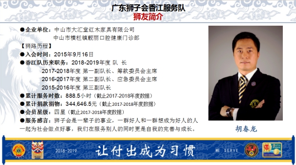 广东狮子会香江队1819年度队长胡春龙(中山大汇堂、唐百年红木家具董事长、横栏靓丽口腔门诊部股东)