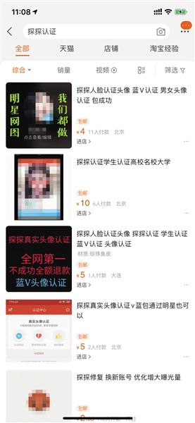 11月10日,新京报记者在某电商平台搜索关键词“人脸认证”后,发现首页、商品宣称可以通过“探探人脸认证”。记者在淘网上与之取得联系后,为规避平台监管,对方发来了她的微信号并要求记者添加。