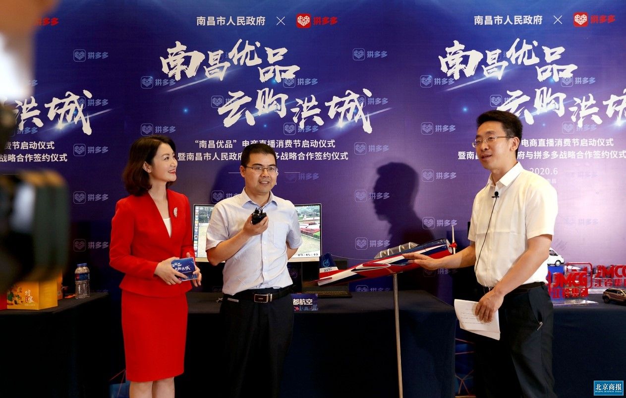 ▲6月22日,南昌市人民政府与拼多多达成战略合作,南昌市政府领导、江西省商务厅领导与拼多多代表,共同启动“南昌优品”电商直播消费节和“南昌优品馆”线上展销专场。(摄影:安舜)