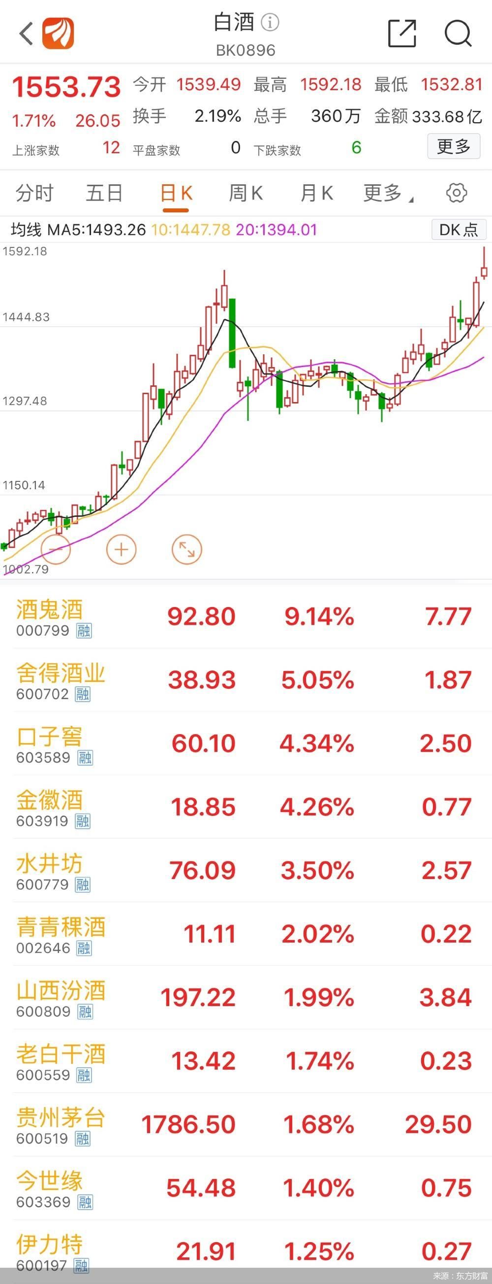 贵州茅台酒股份有限公司(以下简称“贵州茅台”)股价再创新高,盘中,触及1816元/股,截至发稿,日涨幅1.68%。值得注意的是,贵州茅台上次股价创新高是在7月13日,时隔一个半月,茅台股价再创新高,截止今日收盘,贵州茅台股价1786.5元/股,公司总市值达到2.2万亿。北京商报记者发现,今日白酒板块多支股票飘红,截至发稿,白酒板块涨幅1.71%,其中酒鬼酒涨幅9.14%,以92.8元/股收盘;舍得酒业涨幅5.05%,以38.93元/股收盘;山西汾酒涨幅1.99%,以197.22元/收盘。