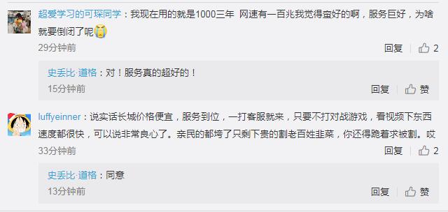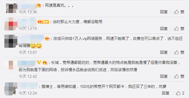 也有网友力挺长城宽带:“网速有一百兆我觉得蛮好的啊,服务巨好。说实话长城价格便宜,服务到位,一打客服就来,只要不打对战游戏,看视频下东西速度都很快,可以说非常良心了。”