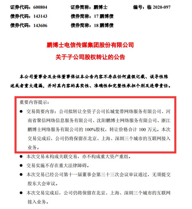 日前,鹏博士发布公告称,公司拟转让4家全资子公司的100%股权给中安实业投资(深圳)有限公司(以下简称“中安实业”或“受让方”),转让价格合计100万元。其中,备受关注的长城宽带网络服务有限公司(以下简称“长城宽带”)就在其中。本次交易完成后,公司仍将保留在北京、上海、深圳三个城市的互联网接入业务。