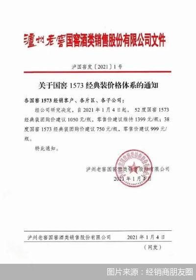 根据国窖销售公司通知显示,自2021年1月4日起,52度国窖1573经典装团购价建议1050元/瓶,零售价建议维持1399元/瓶,38度国窖1573经典装团购价建议750元/瓶,零售价建议999元/瓶。