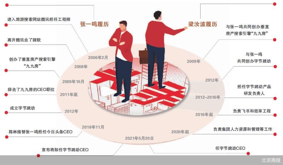 公开资料显示,梁汝波与张一鸣是大学同学,两人自2009年共同创办垂直房产搜索引擎“九九房”起,即成为长期创业伙伴。2012年,梁汝波与张一鸣共同创办字节跳动,此后至2016年,梁汝波一直担任字节跳动产品研发负责人,负责早期多个重要产品和业务,包括今日头条、头条号、广告系统和用户增长系统等;2016年起,梁汝波负责飞书和效率工程;2020年起,梁汝波负责集团人力资源和管理等工作。