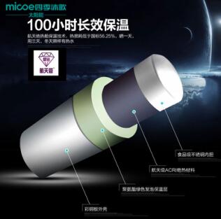 水箱的内胆材料决定了太阳能热水器的保温性能,如果是比较寒冷的北方用户就可以选择保温层厚一点的产品,同时保温层发泡材料也至关重要。目前行业内最先进的发泡材料为绿色无氟发泡材料,无毒、环保也健康,四季沐歌太阳能热水器就是采用的这种绿色无氟发泡保温层,运用航天绝热原理,推出“绝热舱”技术,食品级不锈钢内胆,航天级ACRI绝热材料,绿色无氟发泡保温层,在水箱与外界之间建立起了一道绝热屏障,有效阻断热散失,保温效果可长达100小时。