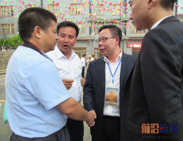 7月20日,在柯倮洛姆彝族火把节上,“一带一路”国际日组委会主席CANUTE(陈恩田)(左起第三)握手前沿时报记者李才武。 刘世艳 摄