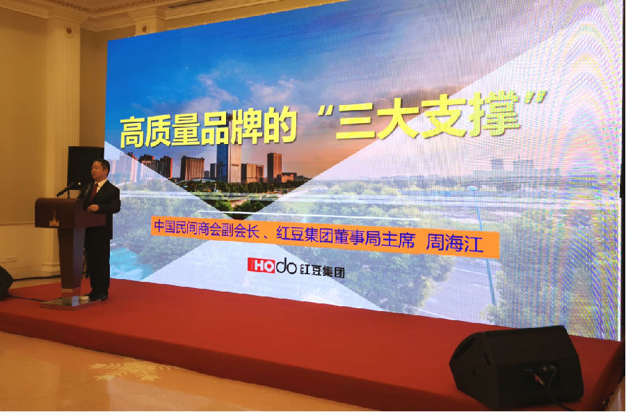 中国企业品牌建设分论坛在当天下午同期举行,中国石化董事长、党组书记张玉卓,中国建筑总经理、党组副书记郑学选,中核集团董事、党组副书记李清堂,国家电网党组副书记韩君,中国中车党委常委、副总裁王宫成,光明食品(集团)党委书记、董事长是明芳,中国民间商会副会长、红豆集团董事局主席周海江受邀出席论坛并作主旨发言。作为,民企代表的周海江与嘉宾分享了《高质量品牌的“三大支撑”》。