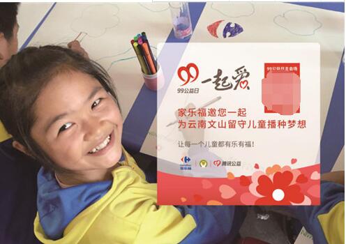 一人力薄,二人有从,三人成众,众志成城。在今年99公益日期间(9月7日至9日),家乐福携手中国儿童少年基金会、腾讯公益在全国范围内发起关注留守儿童爱心活动,希望集合社会各方的力量将点滴爱心汇聚成希望星海,把关爱送去千里开外的云南,为兴建文山儿童快乐家园募集善款,为当地社区近1,300名留守儿童提供更好的成长环境。