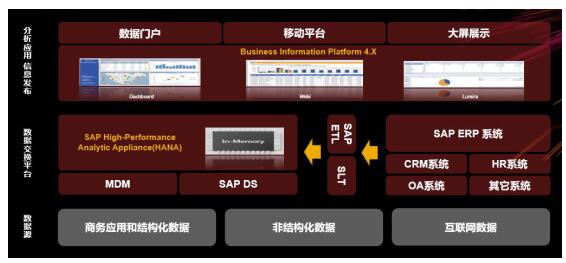 这个是SAP的BI解决方案,现在中国很多大型国企都是利用的SAP的解决方案,比如中石化、中石油、中粮。SAP BI主要的数据源是ERP,它也有相应的ETL的工具,包括实时的和非实时的采集工具。数据抽取后存放在数据仓库中,以前的数仓是BW,现在是BW on HANA或者是HANA,当然数据仓库也可以不用SAP的解决方案,也可以用Oracle等各种数据库。在数据仓库基础之上,会有BI工具这一层,就是SAP自己的BO。