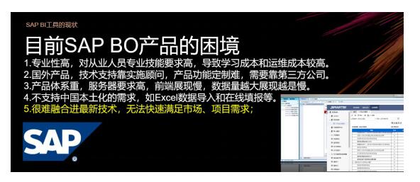 第四点就是它有一些本土化的需求是满足不了的,像我们在用系统过程当中总会有这样一些情况就是咱们不可能用系统满足所有的需求,总会有一些手工数据,那很多时候用户都会提出比如说我要求做excel导入,可不可以做在线填报,“对不起,BO都不支持”,这都是国外一些产品的这样一些问题。