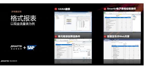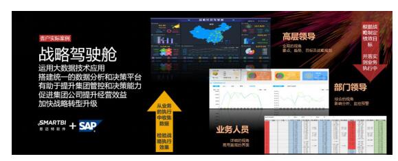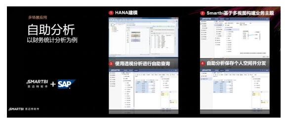 因此为了满足我的客户需求,我就开始推SAP数据仓库HANA+Smartbi前端工具的解决方案,Smartbi从企业最基本的格式报表到自助分析,再到数据可视化、到数据挖掘以及基础的数据采集平台,功能是很全的,所以说不用担心没有满足不了的前端的数据展现需求。