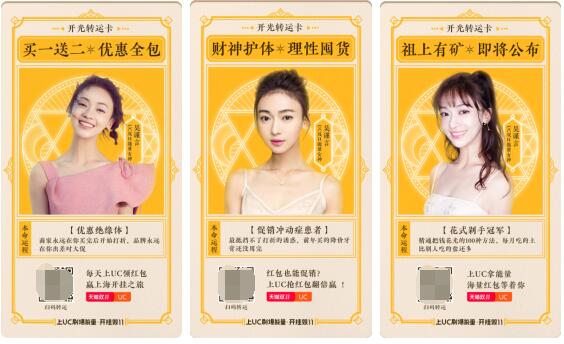 回答谨言的三个问题,收下UC双11能量女神的开光转运卡!这样的财运符就问你收不收!测试结果页的命运属性与双11剁手人设强关联,“促销冲动症患者“”优惠绝缘体“”花式剁手,“戳中了多少人的心!不愧是娘娘,洞察一切!想求一个财神护体符保平安!
