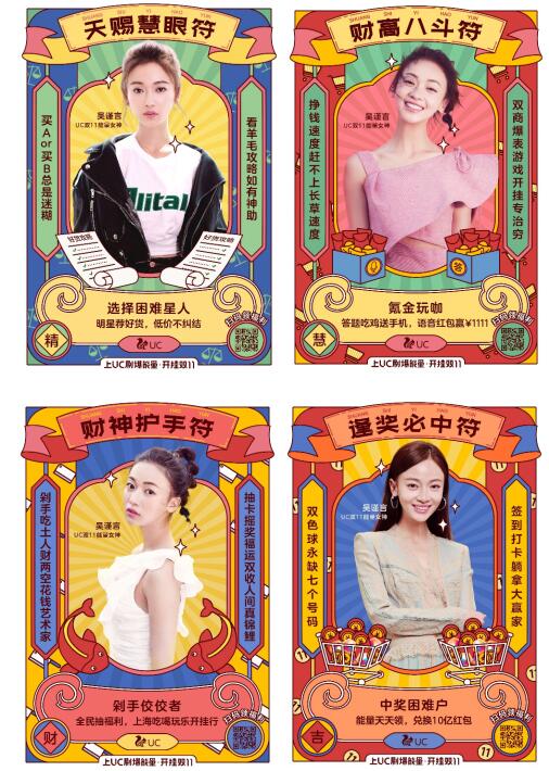 这套UC和吴谨言此番联手推出的2018年双11“玄学潮物”也是相当应景,财神护手符专治剁手、逢奖比中符随手解救中奖困难户、财高八斗符游戏玩咖必备……就问一句这套双11神符海报准备出周边吗?小本子记下,已列入双11必买清单get ✅!