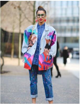 涂鸦、印花的元素在时尚圈的火热度从未减退,印花外套+印花牛仔裤创造出了醒目、冲突的视觉效果,色彩搭配上反而有不一样的化学作用。