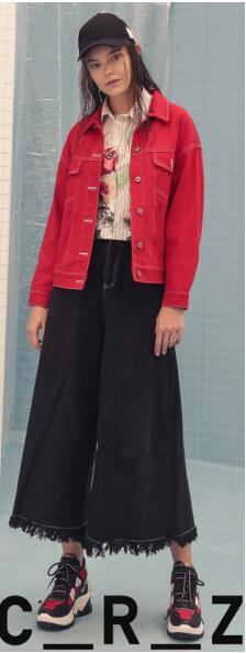 如果觉得凹造型不够有型的话的话,不妨加一件外套,让整体造型更有层次感。喜欢潮酷路线的仙女,可以试试CRZ这件印花牛仔外套,亮眼的红色一出场就足以赚足大家的眼光,休闲有余而时髦万分,满满的男友风,帅气到不行!和潮味十足的黑色阔腿裤组cp,天生便具有一种生人勿进的气场,街拍味十足。