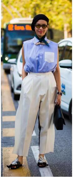 如果太过简洁,显得很无趣的话,可以在上衣上花点儿心思,选择有设计感或有细节的款式,再来个小丝巾,就别有一番滋味了。