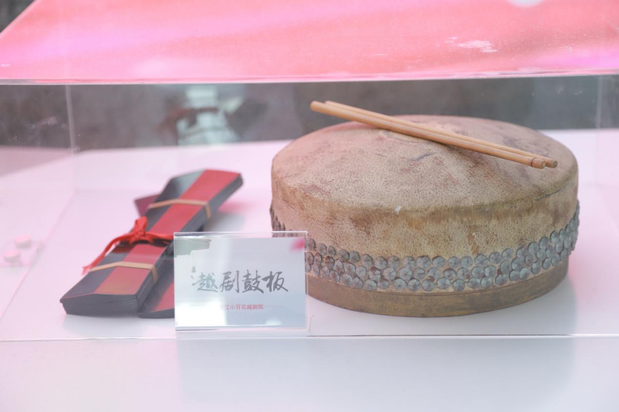 特展现场的三国演义地戏剧本、关公面具、越剧鼓板