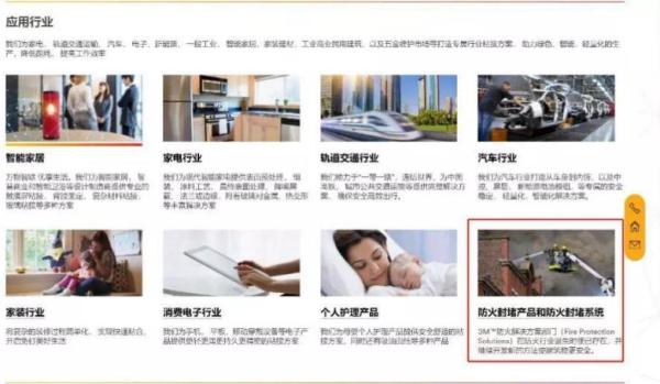 进入3M™胶粘官方网站首页 下拉找到“应用行业-防火封堵产品和防火封堵系统”,即可到达页面。