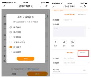机构所有的收费活动都可以用收费接龙来做,像机构班级的收费,新生的报名,老生的加报,活动的收款捐款等,老师只需将相关的链接分享出去,新老生家长点击就可以选择相关的课程或项目付费,活动直接收费系统自动核对账目,解决传统微信群手动记账与登记的痛点,这个方法也可以应用到续费,家长的操作很简便,不需要来学校排长队了,续费便捷度大大提升。
