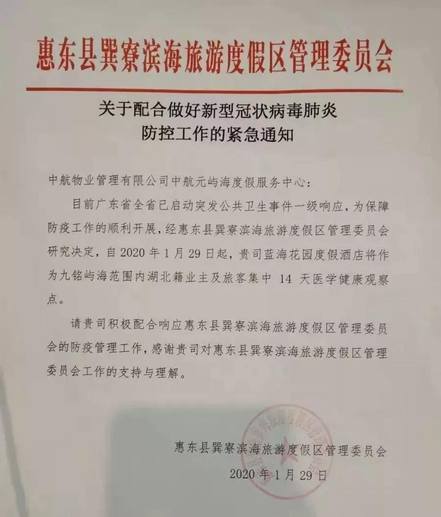 在接到巽寮管委会《关于配合做好新型冠状病毒肺炎防控工作的紧急通知》后,中航物业屿海度假服务,防疫应急小组积极响应政府要求,提前完成中航物业蓝海花园度假酒店楼层与客房消杀,做好入住准备工作,迎接湖北同胞的到来。项目多次与巽寮管委会对湖北同胞集中观察点的防疫管控及湖北同胞关怀工作进行了意见交流,积极配合管委会开展湖北同胞14天集中医学观察工作。