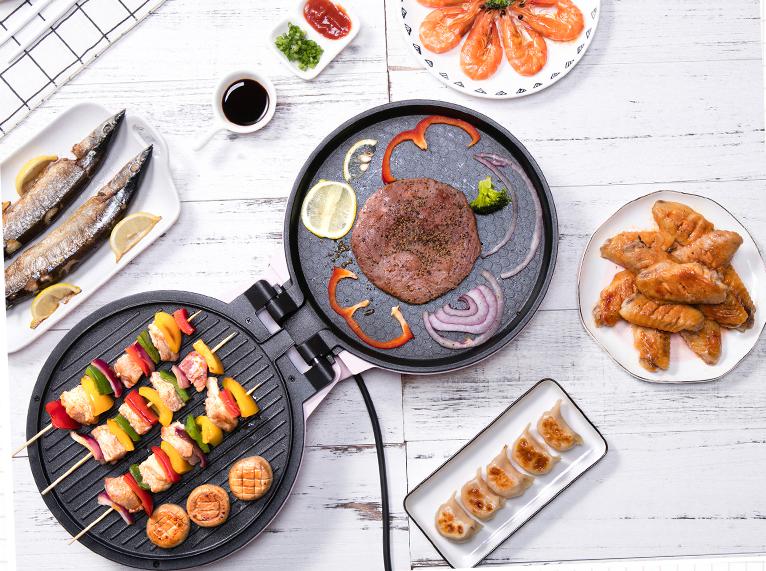 4、把小熊电饼铛双面展开,双盘煎烤独立控温,一盘煎烤肉类,一盘烤制素菜。烤肉滋滋响、蔬菜油亮亮,在欢声笑语中和家人边吃边烤共享宅家美味时光。