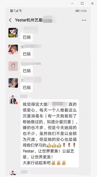艺星星粉阿丽在看到艺星集团发出的爱心接力号召后,立即就捐赠了100元,而且随手将链接转发到家族群里和朋友圈,号召家人们和朋友们一起献爱心。