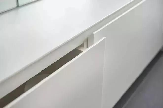▲比起开在柜门上的凹槽,这款凹槽向下的隐藏式柜门拉手的隐蔽效果更强,而且还能避免凹槽堆积灰尘,更好清理卫生。