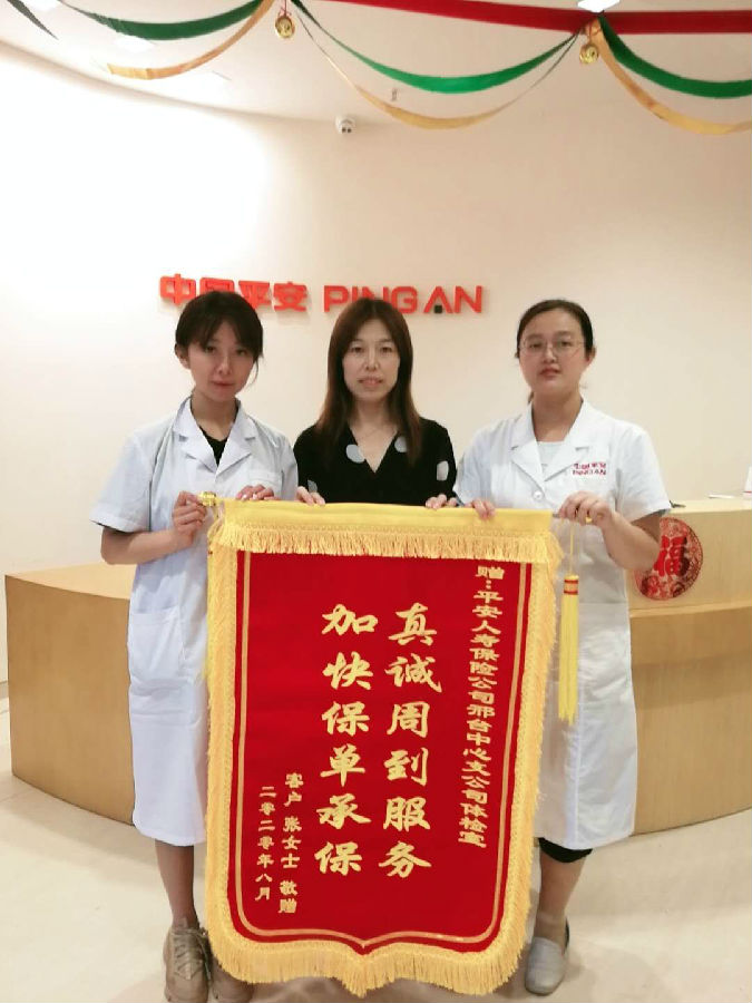 近日,平安人寿邢台中支体检室收到两面绣有“错时服务周到,体检服务热情”和“真诚周到服务,加快保单承保”字样的鲜艳锦族,对体检室的高效服务,专业贴心表示感谢。