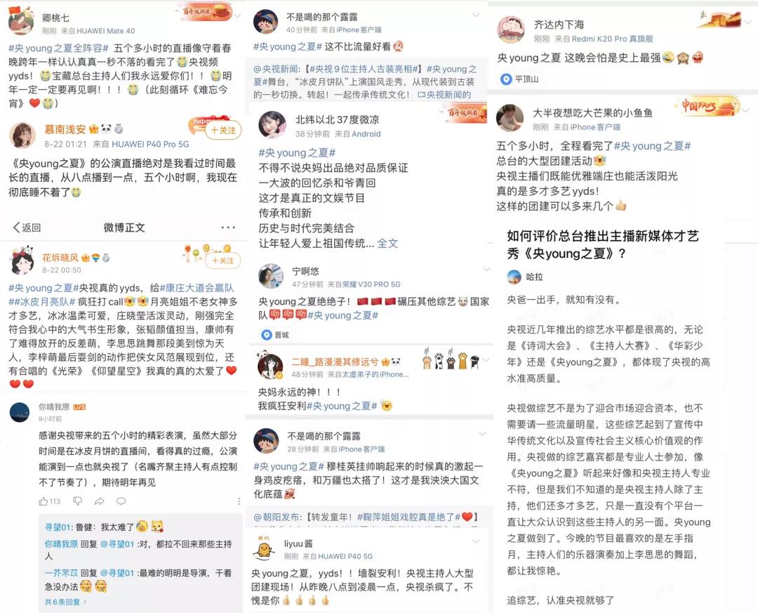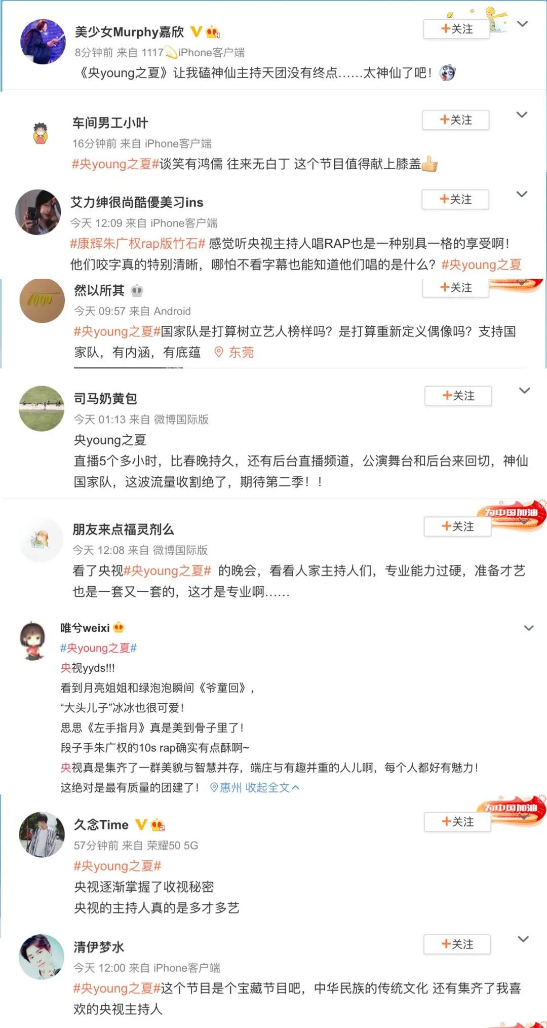网友的关注也让许多话题登上热搜,#央视9位主持人古装亮相# 登上微博热搜,,#央视主持人惊艳合奏左手指月# 、#王冰冰等主播一首歌串起14部国产动画# 、#开美颜后的撒贝宁# 等话题登上微博热搜TOP3。