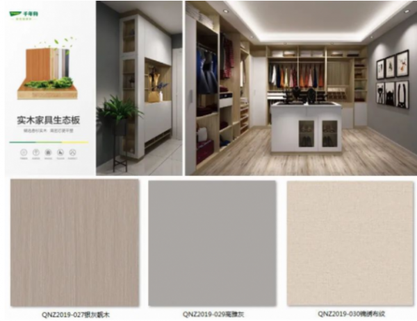 、高端环保型板材,以香杉木细木工板为基础板芯,增加HDF平整层,外层采用环保三聚氰胺浸渍纸加工而成的高品质家具生态板,具有平整度高、防潮性强、装饰性佳、生态环保、免漆易加工等特点。2019年,千年舟家具生态板19款全新花色重磅上市,让消费者有了更多高颜值的选择。