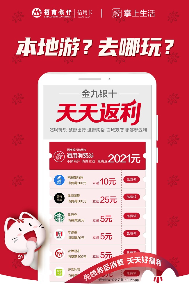 此次招商银行信用卡“金九银十 天天返利”活动面向6700多万信用卡持卡人,9月15日至10月15日期间,持卡人可无门槛,取,商户返利券,返利券金额从5元、10元至100元不等,可在如奥特莱斯、沃尔玛、永辉超市、星巴克、肯德基、必胜客、携程、指定免税店等商家使用,涵盖吃喝玩乐、旅游出行、逛街购物等各个生活场景。