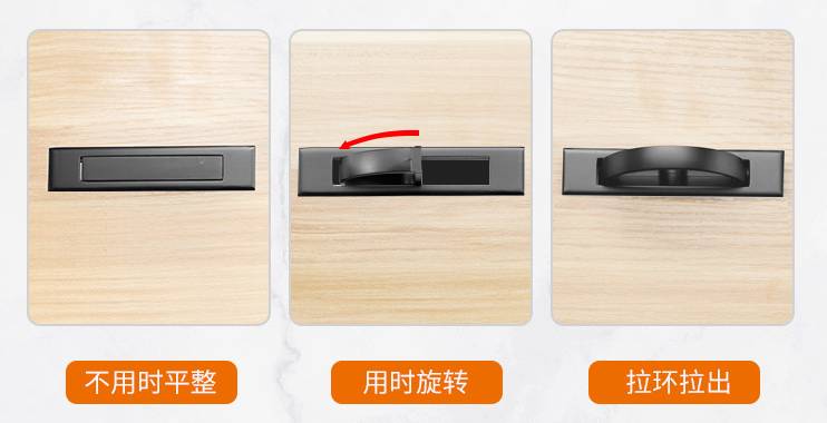 卡贝隐藏式拉手采用旋转式设计,不用的时候隐藏起来,跟柜子的表面处在同一平面上,需要的时候旋出拉环即可。这种拉手可以和整个柜门融为一体,简约大方,同时也不容易落灰。
