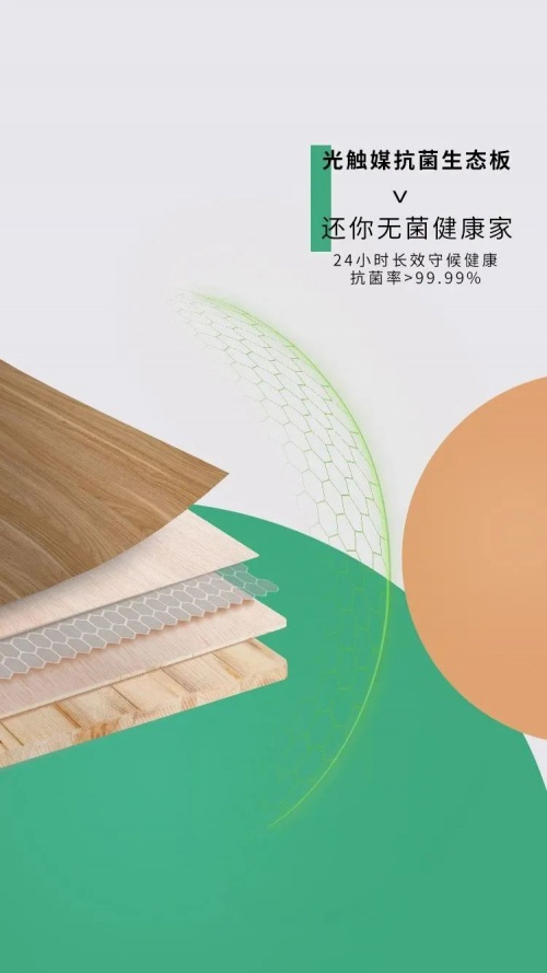 为了满足大众健康抗菌的需求,千年舟研发出光触媒抗菌板、天然豆香抗菌生态板等产品,在保留家居产品基础功能同时,也增强了其健康抗菌的功能。这两类产品都使用了千年舟,专利技术——新一代纳米光触媒技术,具有环保无毒、消毒杀菌等特性。该技术的科学原理即是,在光照条件下,可使空气产生电离,损伤空气中细菌细胞膜,抑制和分解细菌蛋白质的合成,从根源处将有害物质分解成无毒无害的二氧化碳和水。