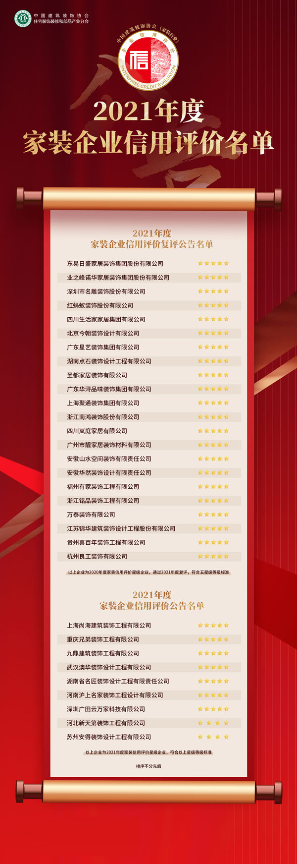 经中国建筑装饰协会组织,北京信构信用管理有限公司严格评审,采用定性与定量相结合的方法,分析受评主体的基本素质、经营管理水平、财务实力、公共信用情况并综合打分,全国9家家装企业通过2021年度家装企业信用评价,成为,企业。2020年度22家信用五星家装企业通过复评。