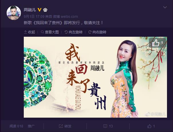 日前,周融儿在微博上称新歌《我回来了贵州》即将录制完成,预计近期上线。此消息一出,顿时就引得网友一番轰动。歌迷纷纷在微博留言“终于等到你”。