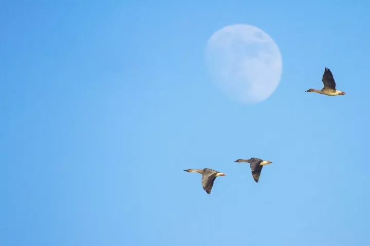 江西鄱阳湖,一个难得的蓝天,就在满月的前几天,一小队从北方迁徙而来越冬的大雁就在天空中鸣叫着穿梭于湖面之上。镜头中,前面的一只鸿雁在后面两只豆雁的陪伴下正好掠过了天空中的上弦月。