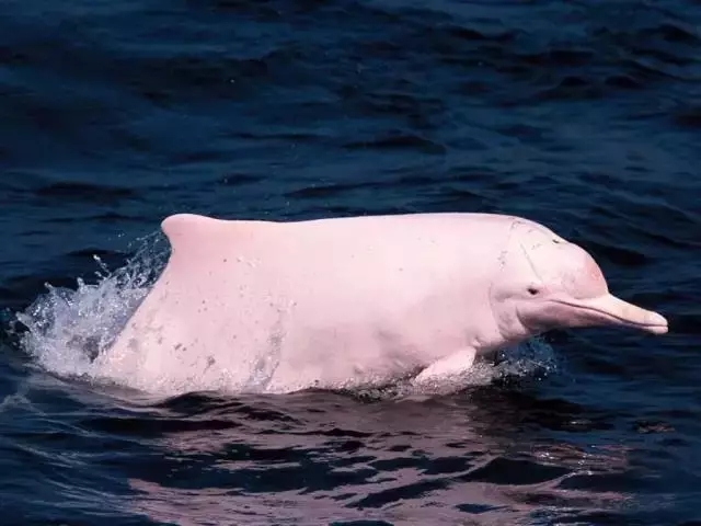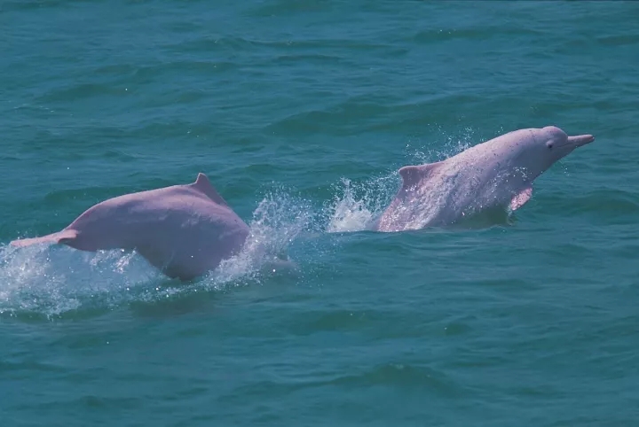 中华白海豚是国家一级保护动物,素有“水上大熊猫”之称,也是香港1997年回归的吉祥物,在台湾被称之为妈祖鱼。珠江口流域拥有我国最大的中华白海豚种群,约2500头,但由于近些年填海造地项目的激增,海洋环境的污染,中华白海豚的种群数量正在以每年2.46%的趋势下降。图中是2条青年中华白海豚,它们的颜色正在从灰色向粉红色退淡。