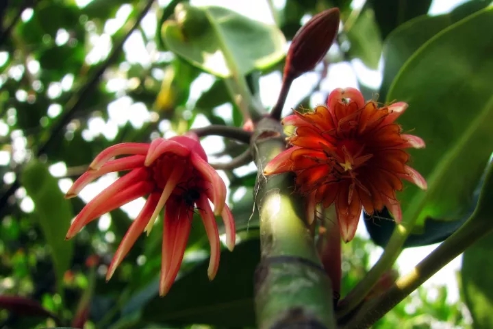 木榄是常见的一种红树植物,它跟红树林名称的由来还有一定的渊源。据说早年马来人在砍伐红树林作为薪材时,他们发现柴刀的刀口变成红色,而木材的断面也成了红色,于是取名红树林。图中是两朵木榄的红花,这是红树林里少有的红色元素。