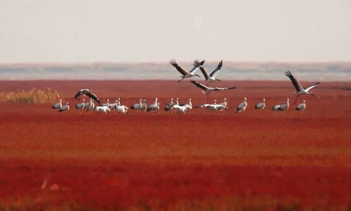 东方白鹳,是中国最优雅的大鸟之一,它是中国最濒危的鹳类,也是国家一级重点保护动物。每年秋季,它们从东北的繁殖地飞往华东的越冬地,辽宁盘锦的红海滩总是能够吸引它们驻足休憩。