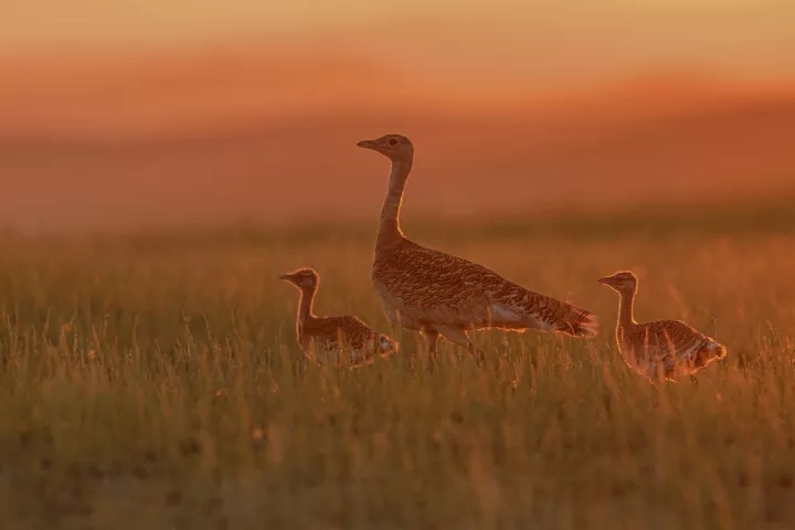 新疆的荒漠草原上生活有三种鸨:大鸨、波斑鸨、小鸨,鸨类善于奔跑形似鸵鸟,喜欢在视野开阔的环境繁殖,有任何威胁都会被提前发现;它们主要吃荒漠植物的嫩芽,也吃沙蜥和昆虫,基本不喝水,非常适应炎热干旱的气候。吉祥三鸨都是非常珍惜的鸟类,它们春天来到新疆各地繁殖,秋季常集结成群,冬季飞往南方越冬。