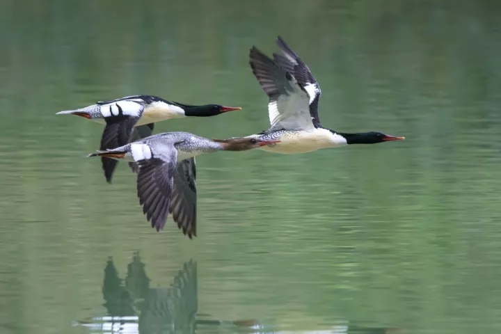 中华秋沙鸭是IUCN红色名录中的濒危物种,也是国家一级重点保护动物。它们体态优美,嗜鱼而生,是一种美丽而神秘的鸭类。这一小队中华秋沙鸭正贴着水面飞行,流线型的身体曲线完全地诠释了适应空气动力学的演化。