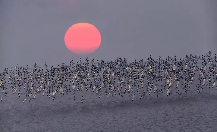 夕阳西下,万羽反嘴鹬集结归巢。天津滨海滩涂湿地,潮涨潮落间为鸟儿们留下了丰盈的食物资源,每年五月中旬回迁归来的反嘴鹬们在这里常有此景发生。