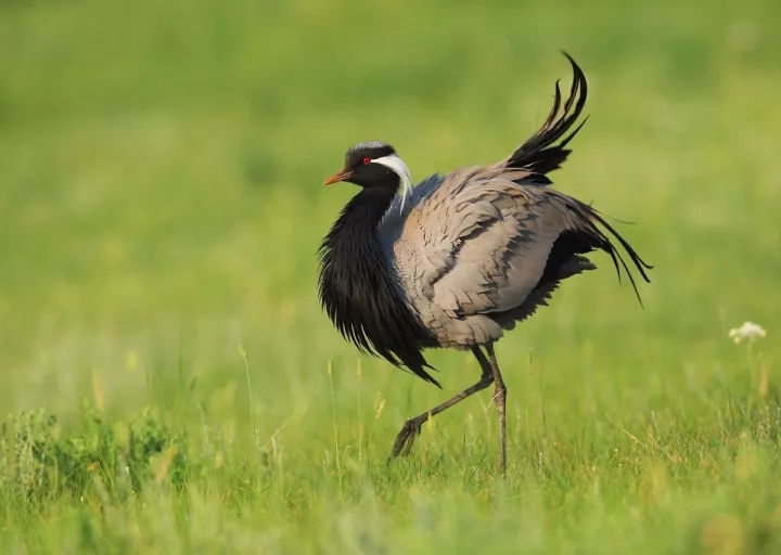 蓑羽鹤,也叫做闺秀鹤,是体态最优美的鹤类之一,它们珍贵、稀少,是国家二级重点保护动物。蓑羽鹤夏季分布在欧亚大陆内陆的草原上,将在这里度过一个愉快的繁殖季,这只蓑羽鹤正翩翩起舞,吸引同伴的注意。