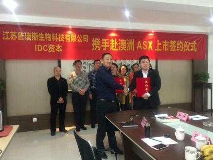 2017年11月11日上午11时,江苏普瑞斯生物科技有限公司签约IDC资本携手赴澳大利亚主板上市。IDC资本担任普瑞斯澳大利亚主板上市的保荐人和上市总顾问,将全程辅导普瑞斯在澳大利亚主板上市.在当地政府领导和普瑞斯股东的共同见证下,普瑞斯董事长与IDC资本集团管理合伙人江艇先生正式签约。