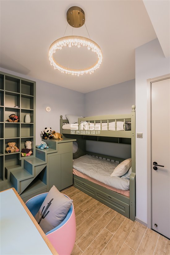 这间以女孩喜爱的绿蓝粉及格子柜为设计重点