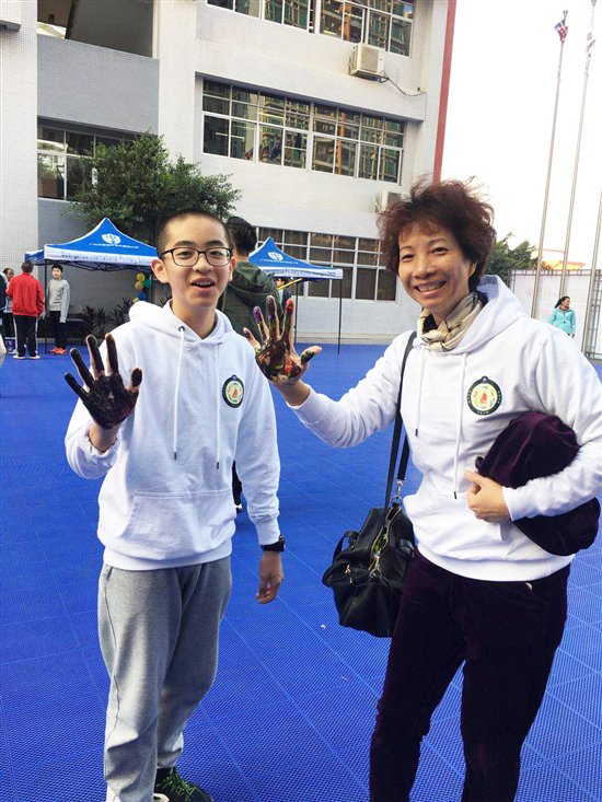 图片文字:运动会入场前,父母和孩子按下亲子手印