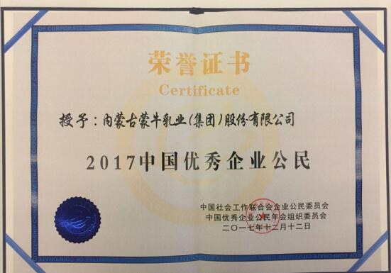 12月12日,在由中国社会工作联合会企业公民委员会主办的“第十三届中国优秀企业公民年会”中,蒙牛再次获得“2017中国优秀企业公民”称号。这既是蒙牛第三次捧得此荣誉,也是中国乳品行业,连续三年获得“中国优秀企业公民”的企业。