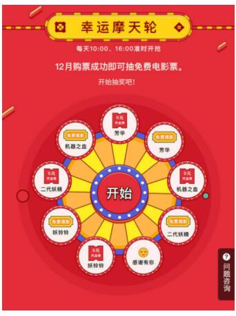 此外,淘票票还推出了“幸运摩天轮”的在线互动游戏,每天10:00、16:00准时开抢,12月份购票成功的用户即可抽免费电影票。淘票票还与大地、万达、中影国际等各大影城达成合作,上线了“影城卡超级开卡”活动,购票,高再减20元。
