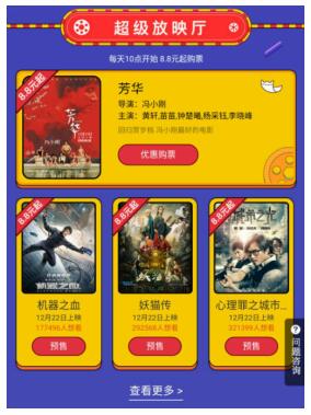 据了解,淘票票贺岁档电影“嘉年华”活动中,每天10点开始8.8元起购票,不仅包括同期上映的《芳华》,还囊括了正在预售的《机器之血》、《妖猫传》、《二代妖精》等等大片。